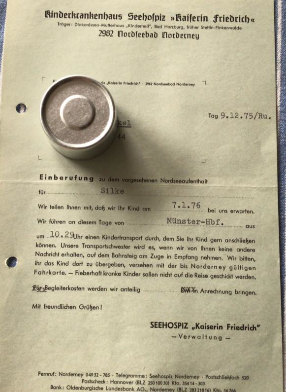 Der Kinderarzt meinte dann, ich müsse mal zur Kur nach Norderney und meine Eltern haben aus lauter Verzweiflung zugestimmt. Auch den strengen Richtlinien im Haus, dass man keinen Kontakt aufnehmen oder mich besuchen darf, stimmten sie zu.