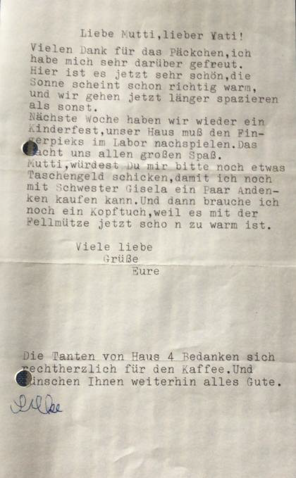 Manchmal kamen allerdings Briefe von zu Hause, die mir dann vorgelesen wurden oder zu Weihnachten auch ein Päckchen. Auch ich durfte Briefe nach Hause schreiben, bzw. die „Tanten“ haben sie für mich verfasst: „Hier ist es jetzt sehr schön, die Sonne scheint schon richtig warm und wir gehen jetzt länger spazieren als sonst.“